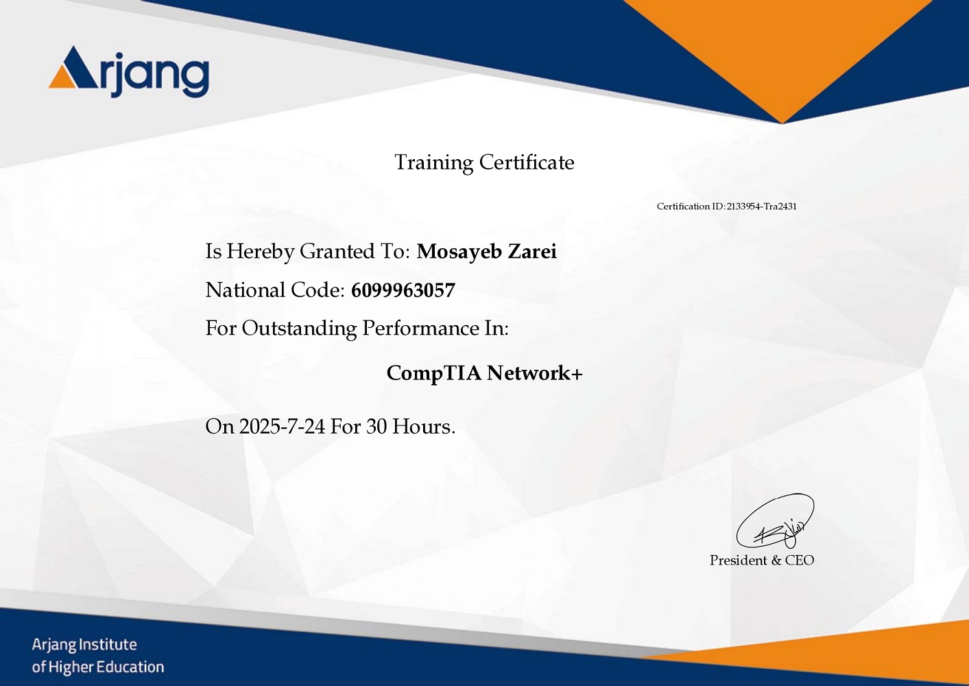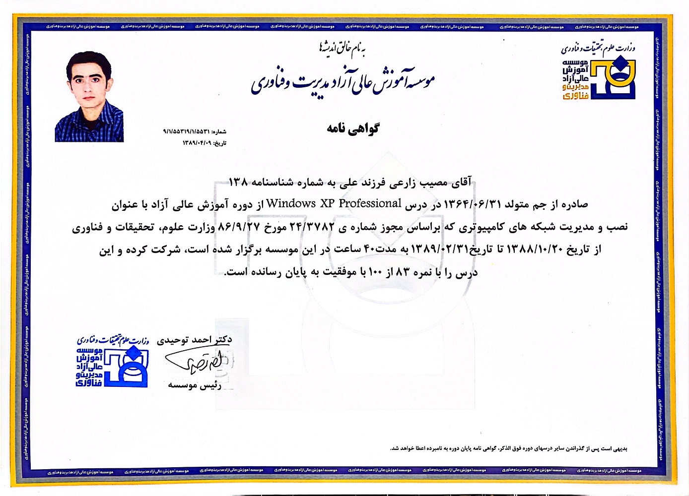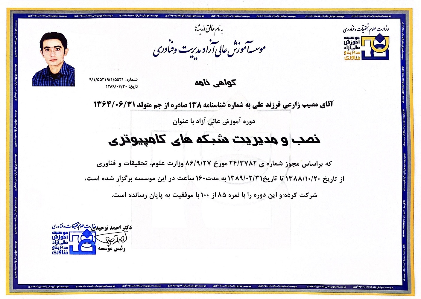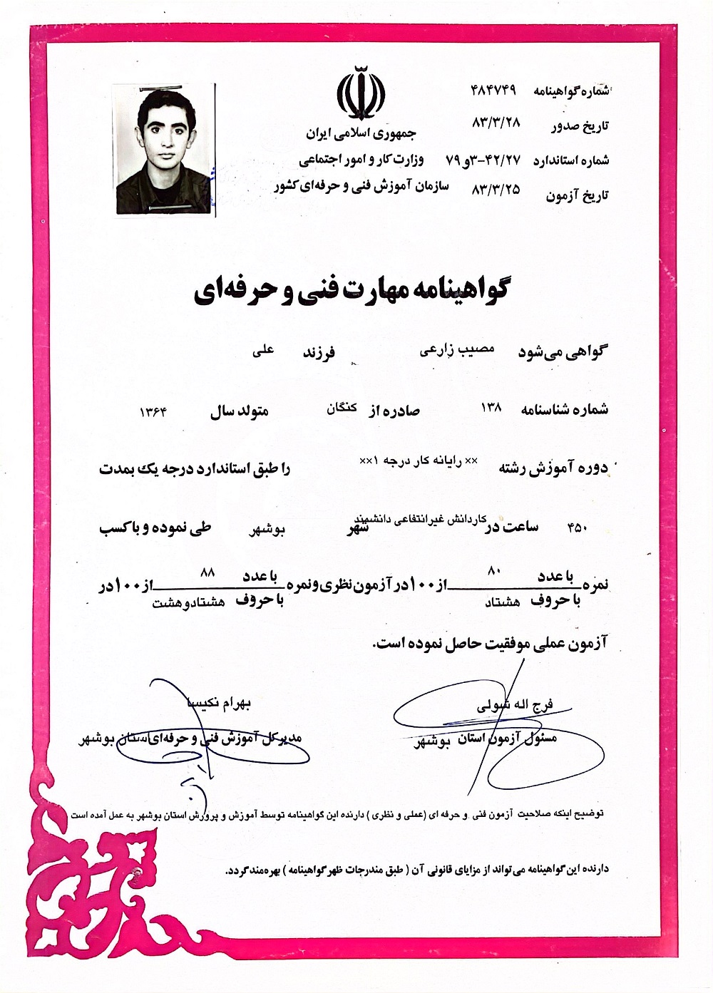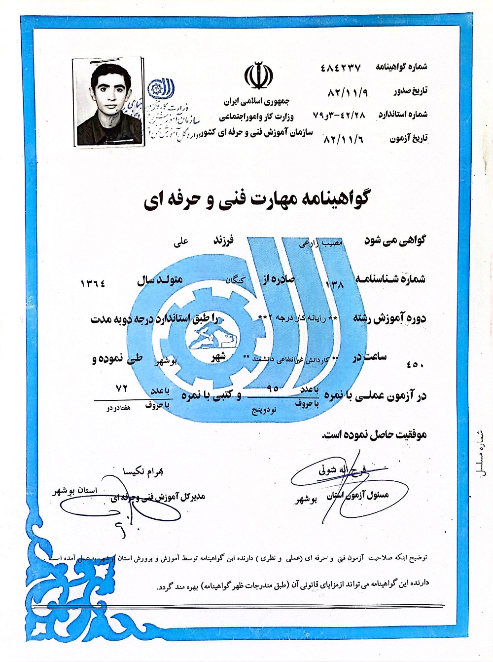 اخذ دیپلم کامپیوتر در سال 1382 از آموزشگاه فنی حرفه ای آزاد بوشهر