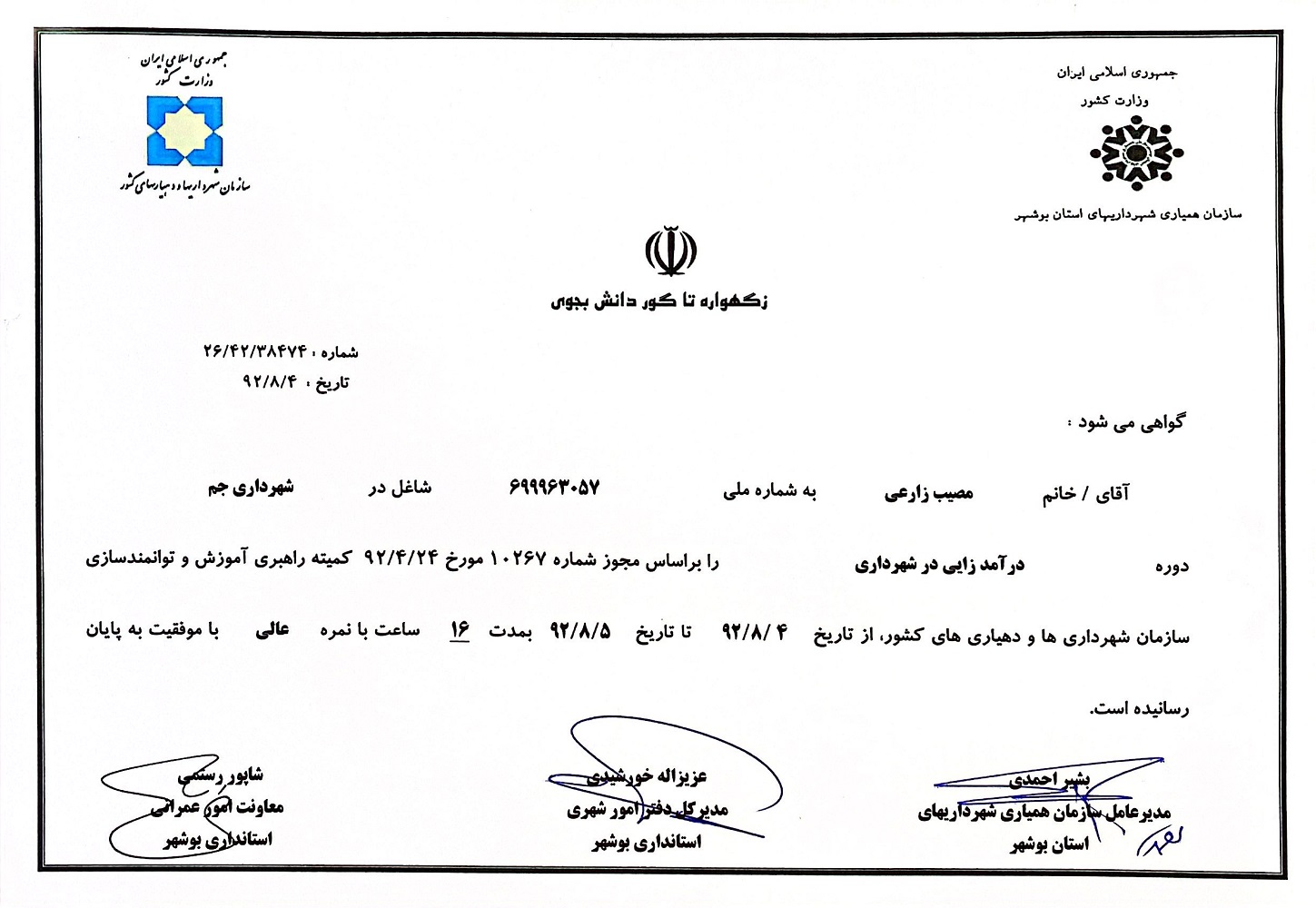 کارشناس واحد درآمد شهرداری جم از سال 1399 تا کنون - دبیر کمیسیون ماده صد - عضو کمیسیون مناقصات و مزایده ها - مسئول سامانه اطلاعات مکانی GIS
