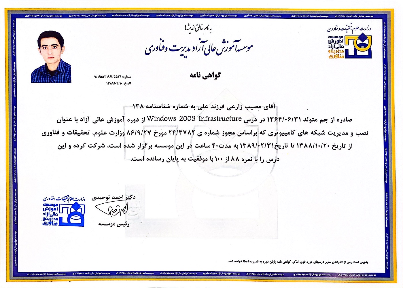 آشنایی با مفاهیم اولیه شبکه های کامپیوتری از قبیل توپولوژهای شبکه، مدیریت IP ها و مدیریت کاربران در AD نصب و مدیریت وب سایت ها در IIS و ...